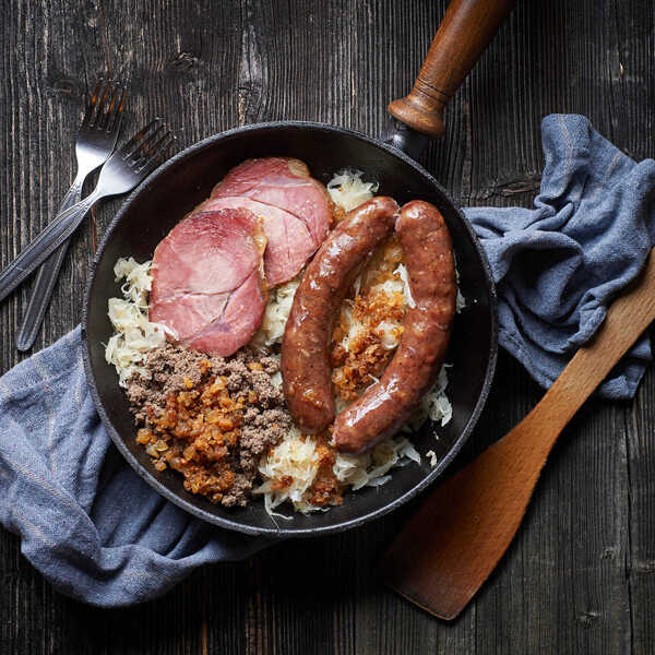 Šink in klobasa z zeljem ter ajdovimi žganci